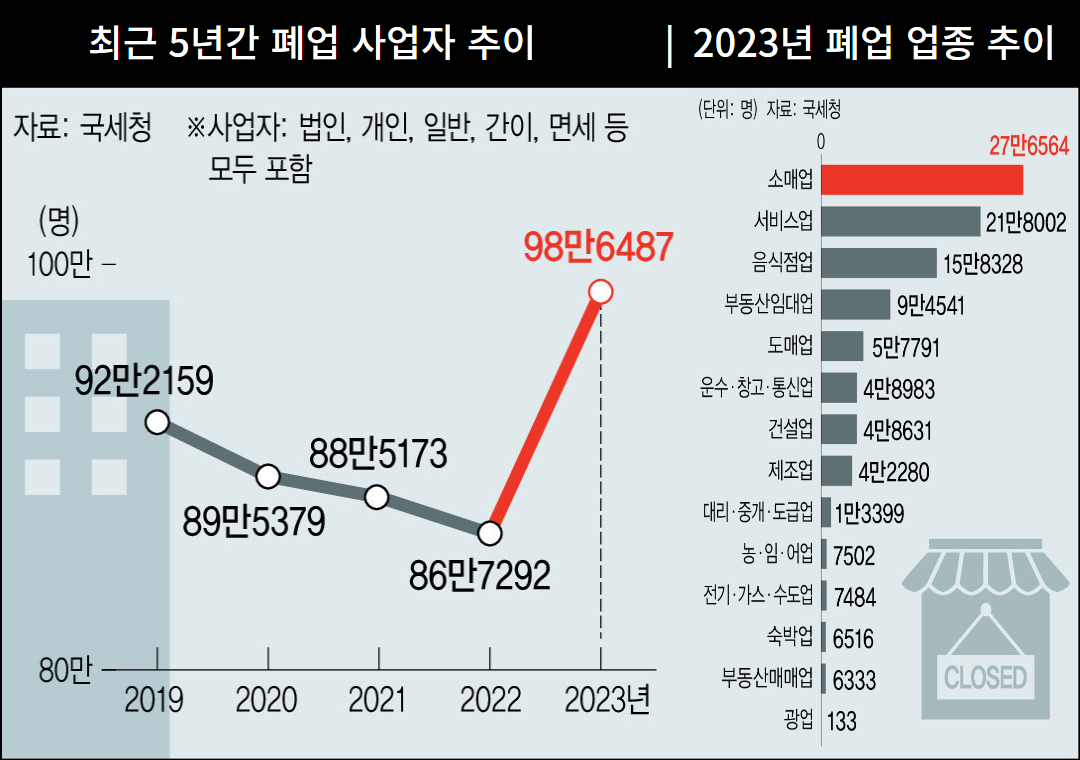 1. 우리나라는 매년 수조원의 국가 보조금에도 불구하고 OECD 국가 중 1~5년 사이 기업 생존율 최하위, 창업대비 폐업률 80%로서 2023년에도여전히 100만건에 달하는 폐업이 발생하였습니다.