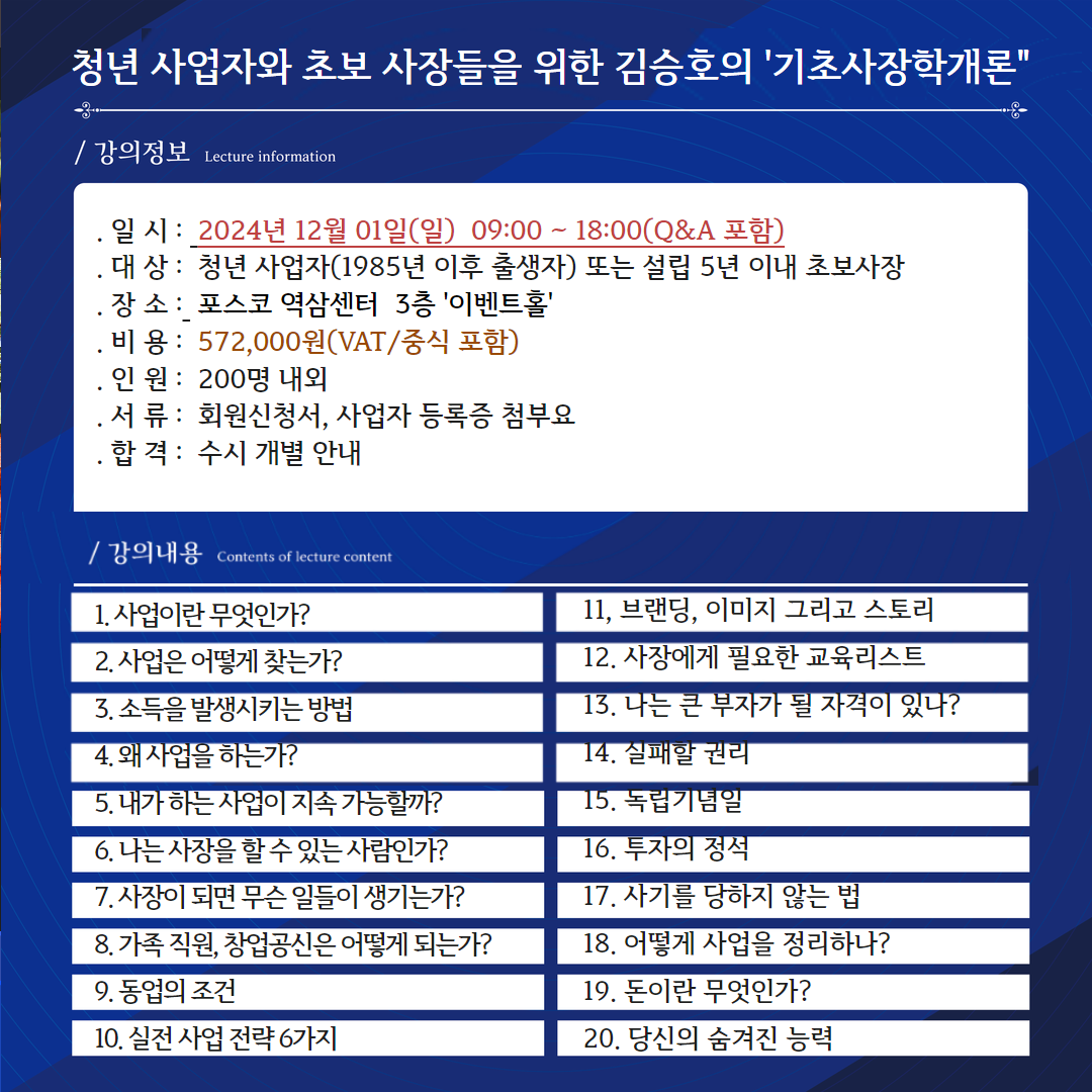 초기 사업 실패의 주 원인이 사업자의 지식과 경험및 능력 부족에 있음을 인식하여 아직 사업 경험이 부족한 청년사업가 및 창업 기간 5년 이내의 초보사장들이 '사장의 기본기'를 익히고 '사업의 본질'을 잡아갈 수 있도록 아래 All-day 수업을 준비하였습니다.