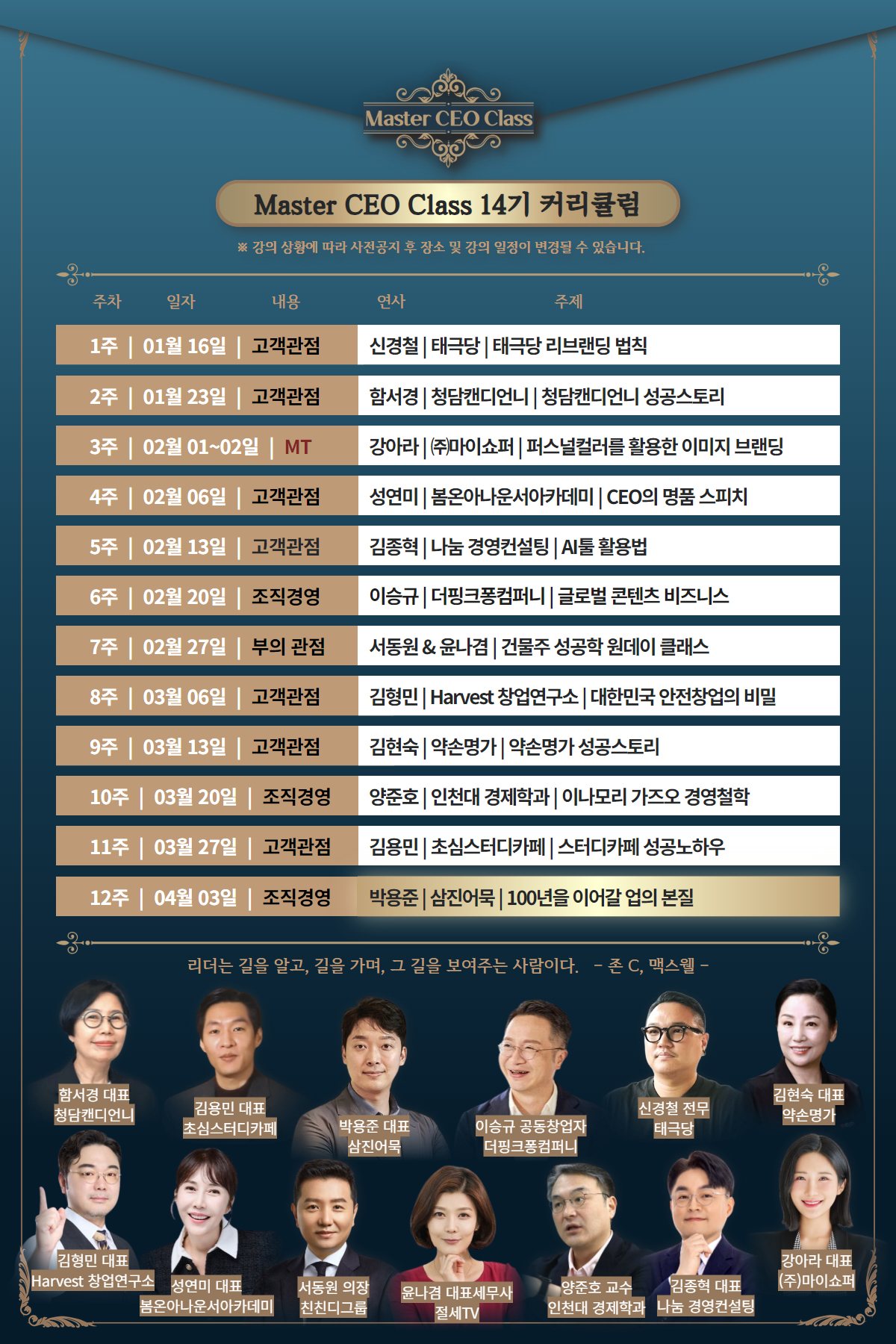 12주간 12명의 Master는 물론, 다른 업에 종사하는 여러 사장들이 함께 모여 어떻게 내 사업을 키워가야 할 것인지 지식과 정보를 공유하고 문제 해결을 위한 아이디어를 나누게 되는 사장들의 집단지성 커뮤니티에 여러분을 모십니다.