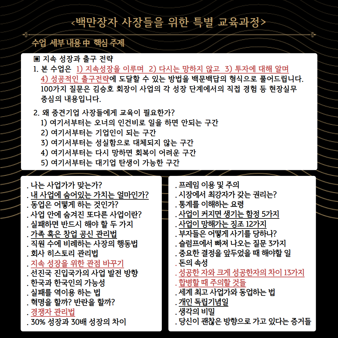 본 수업은 '사장을 가르치는 사장'으로 널리 알려진 스노우폭스 김승호회장이 100억 매출 이상 혹은 그에 준하는 중견 사업가들을 위해 준비한 수업으로서,