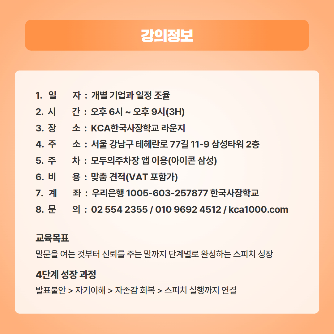 누구 앞에서도 자신 있게 말하는 리더로 성장시켜드립니다.
