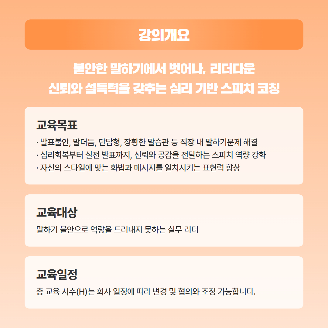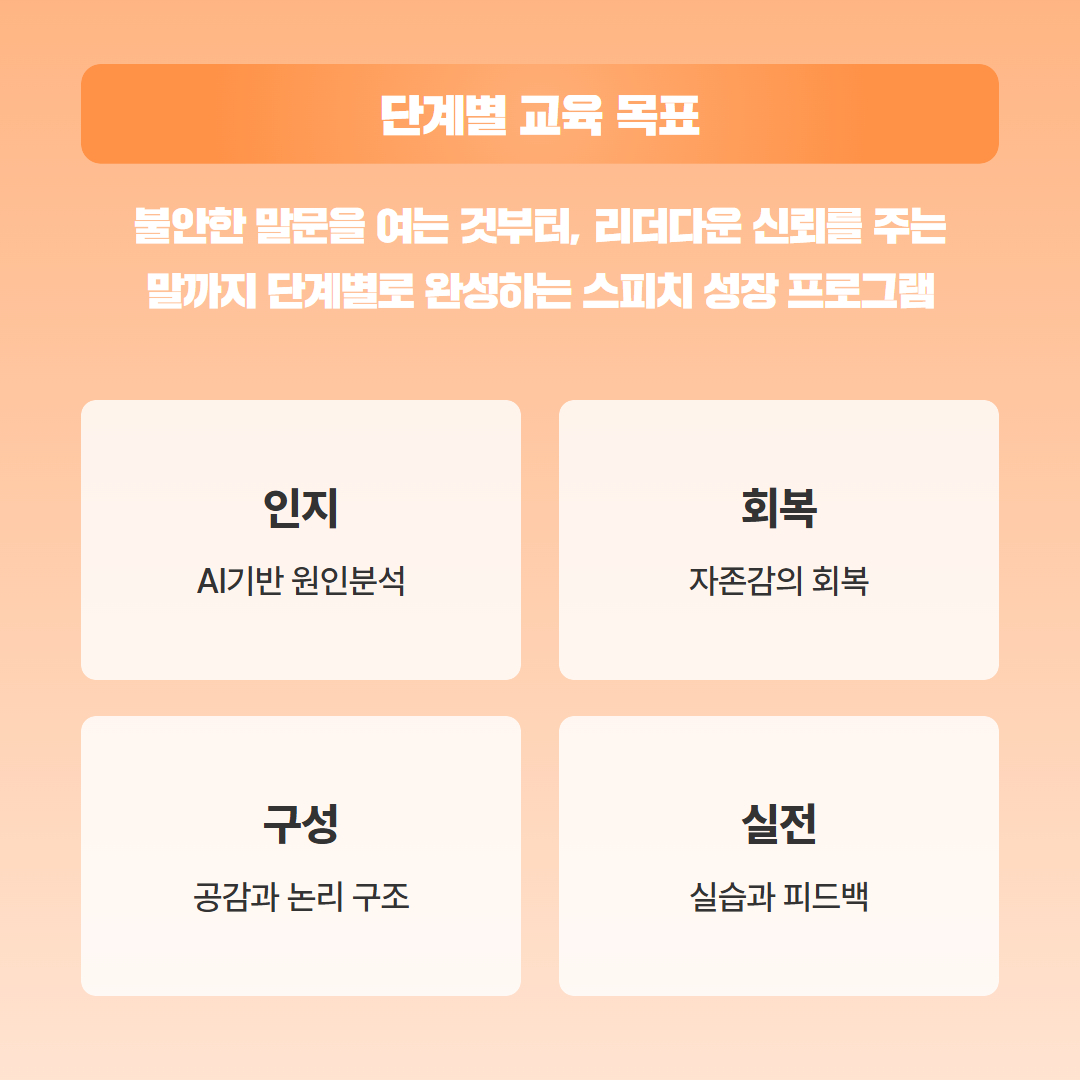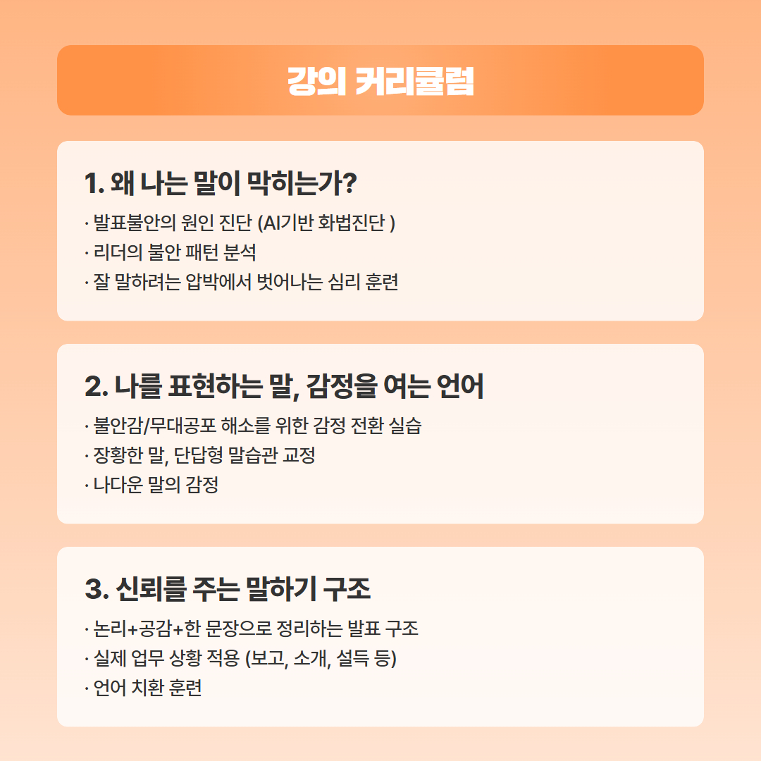 - 억양·톤·제스처 등 무대 위 자신감 훈련