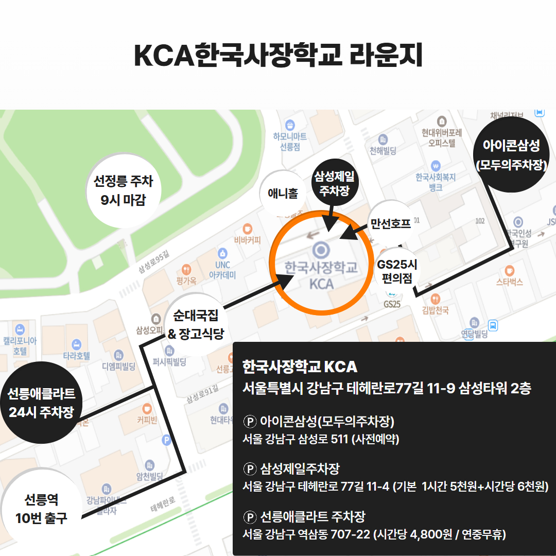 · 시 간 : 서울 강남구 테헤란로 77길 11-9 삼성타워 2층