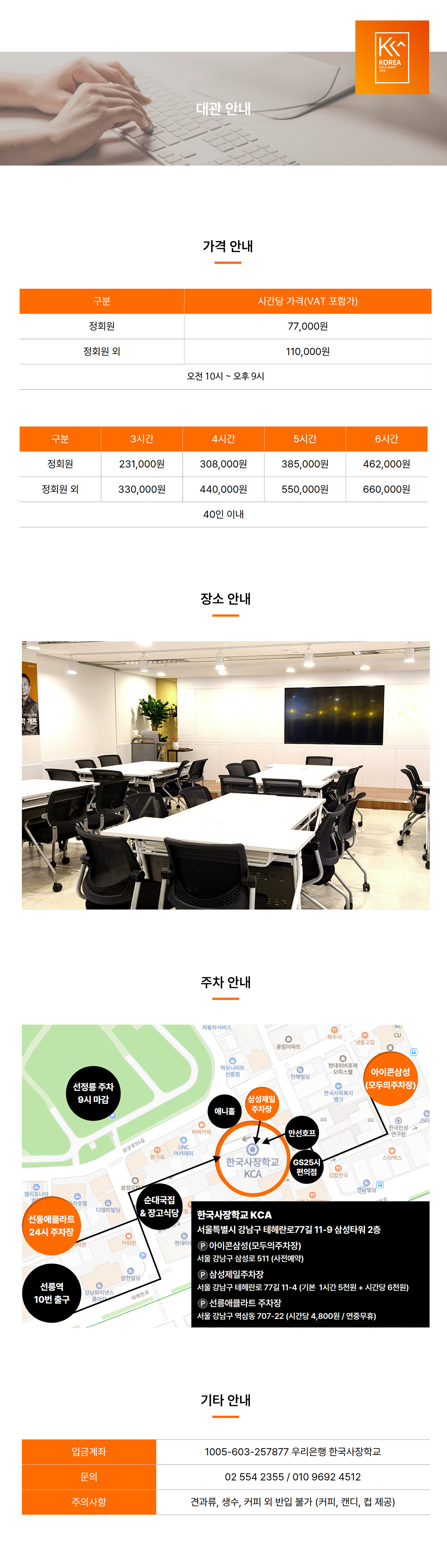 KCA한국사장학교 라운지 대관 안내